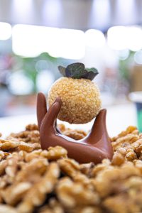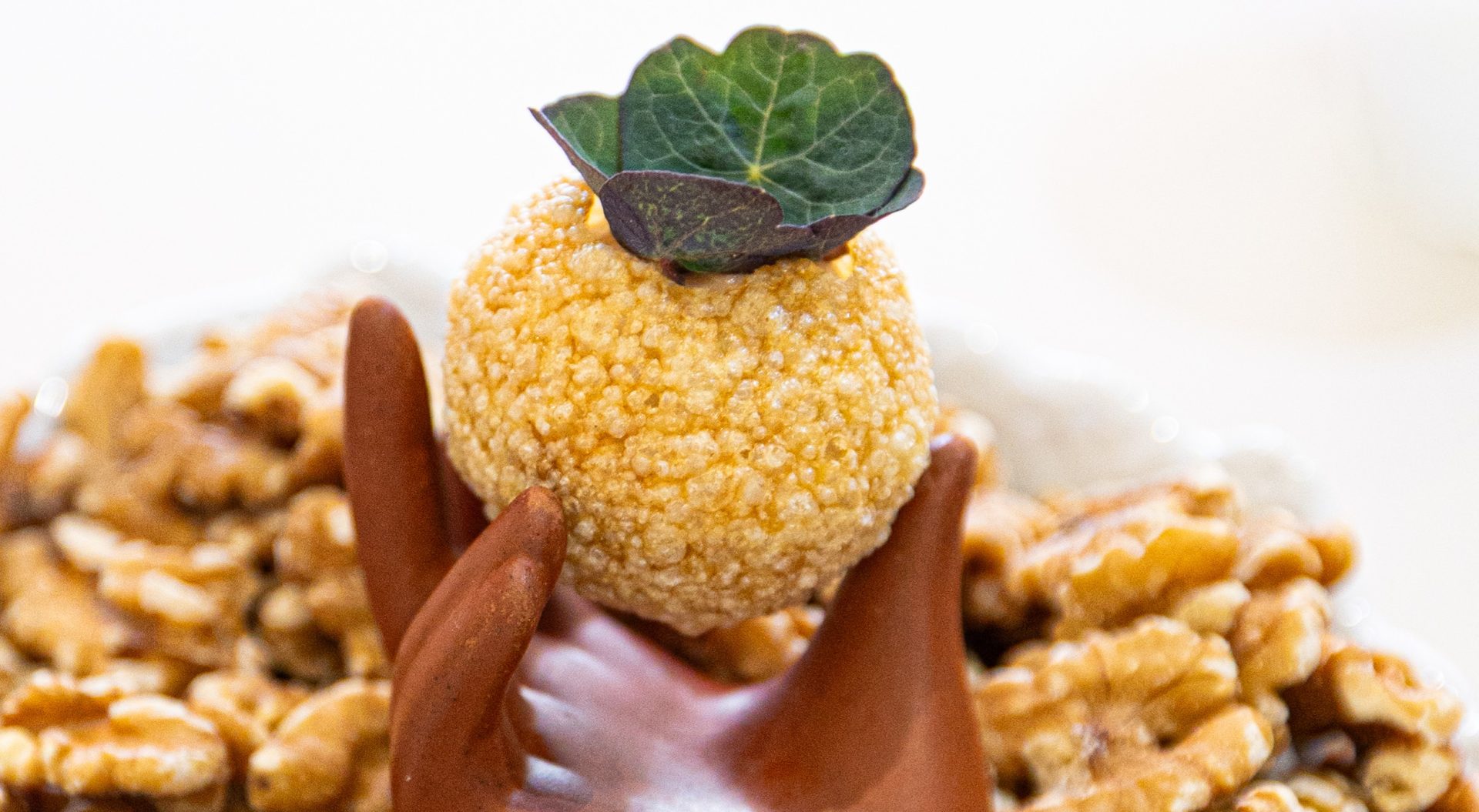 4. Disponer sobre una base de Nueces de California picadas para aportar textura y presentación.